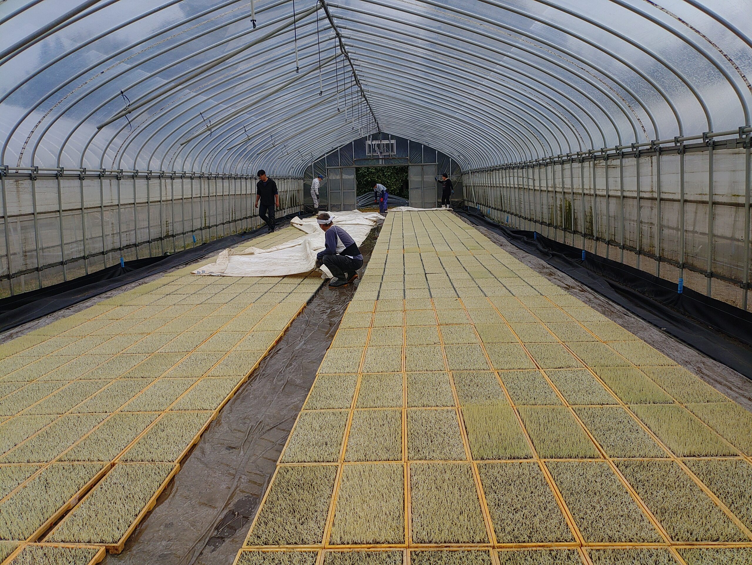 嵐!のような天気になりましたが、今日は苗出ししました。先週播種したのが、発芽しました。約3,000トレイ、約17ha分の苗です。失敗ゼロで作業完了しました。
