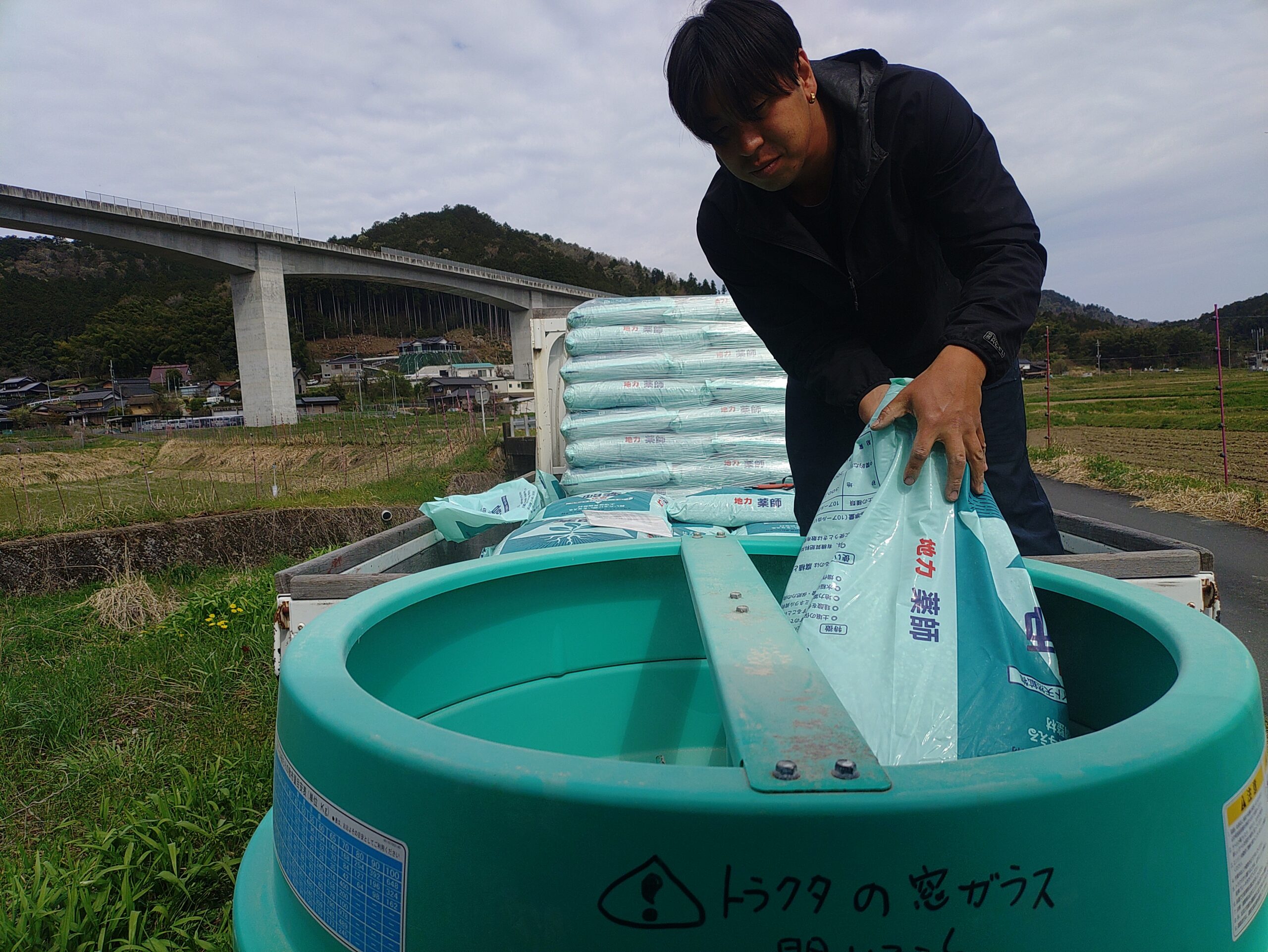 4月13日。お米の味の素を田んぼに撒きます。コンポキャスターというアタッチメントをトラクタに付けてまんねん。